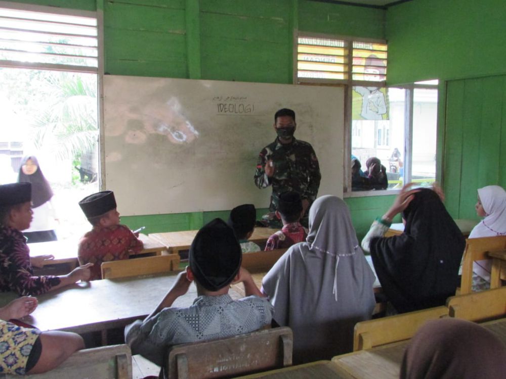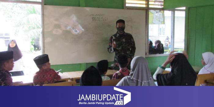 JAMBIUPDATE.CO, JAMBI – Satgas TMMD ke 110 Kodim 0415/Batanghari di Desa Sungaiterap, ajar ideologi ke anak-anak Madrasah Jauharul Falah di Desa Sungaiterap, Senin (29/3/2021) sore.