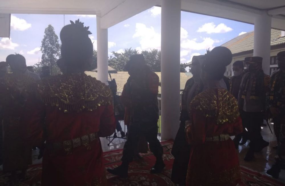 JAMBIUPDATE.CO, JAMBI - Danrem 042/Gapu, Brigjen M Zulkifli, Bupati Muarojambi, Hj Masnah Busroh dan Dansatgas TMMD, Kolonel J Hadiyanto, disambut dengan tari tabur beras kunyit, saat hadiri penutupan program TMMD ke 110 Kodim 0415/Batanghari, di Kantor Bupati Muarojambi, Rabu (31/3/2021) pagi.