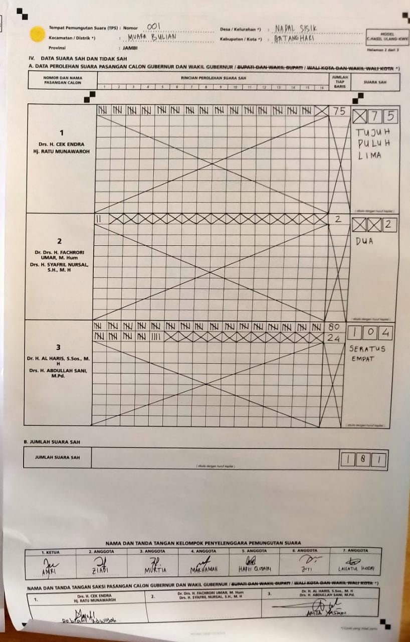 JAMBIUPDATE.CO, BATANGHARI - Hasil penghitungan suara pada Pemungutan Suara Ulang (PSU) Pemilihan Gubernur dan Wakil Gubernur Provinsi Jambi di TPS 01 Desa Napal Sisik Kecamatan Muara Bulian sudah selesai. Kamis (27/05).