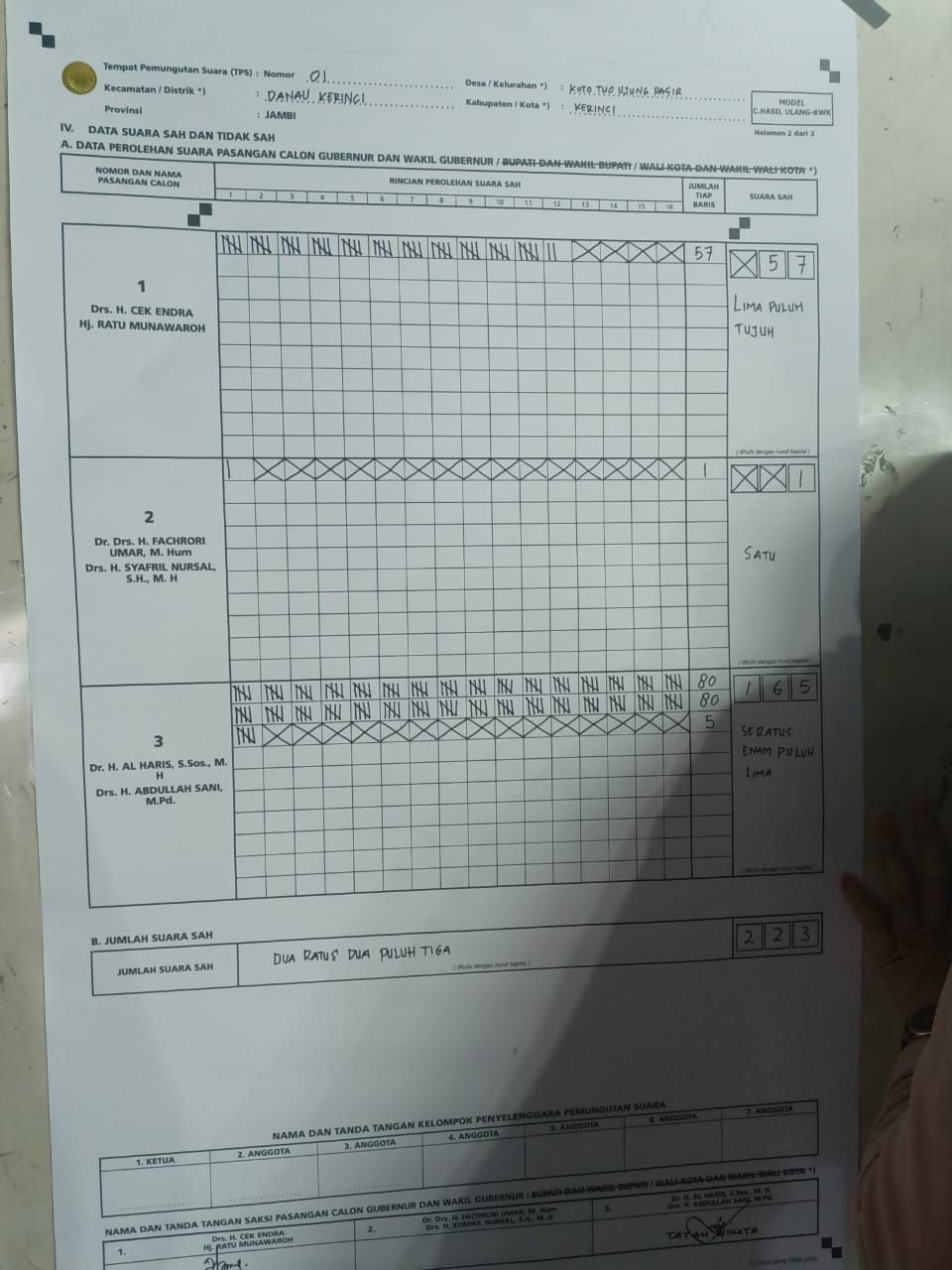 Dimana hasilnya pasangan 01 Cek Endra - Ratu berhasil meraih 57 suara. Pasangan 02 Fahrori - Safril meraih 1 suara, dan pasangan nomor 03 meraih 165 suara.