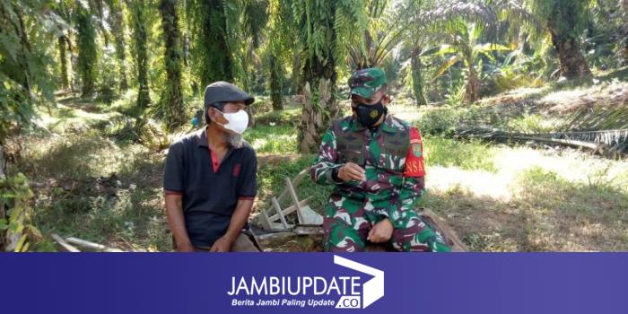Melihat Sutaryo (59) warga Desa Bukit Beringin Kecamatan Bangko Barat Kabupaten Merangin Provinsi Jambi, istirahat sejenak di kebun sawitnya, Dansatgas menghentikan laju kendaraannya dan menghampiri warga tersebut, Sabtu (10/7/2021).