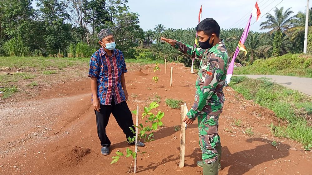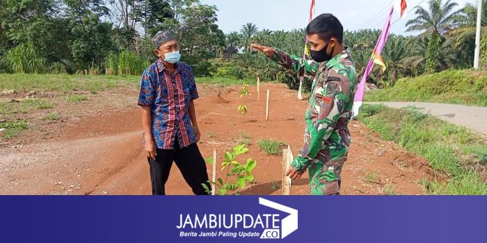 Pratu Budi anggota Satgas TMMD Ke 111 terlihat sedang Komsos dengan Mulyono Syarif (46) warga Desa Bukit Beringin, Kecamatan Bangko Barat, Kabupaten Merangin,memberikan informasi dan manfaat menanam pohon dipinggir lapangan sepak bola, Selasa (13/07/2021).