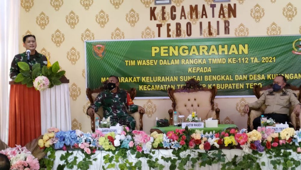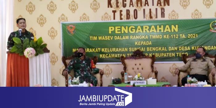 JAMBIUPDATE.CO, TEBO - Tim pengawas dan evaluasi (Wasev) Mabes TNI Mayjen TNI Tri Yuniarto berkunjung ke lokasi TMMD ke-112 Kodim 0416/Bungo Tebo, di langsung bertatap muka dengan unsur forkopimda Tebo, tokoh masyarakat dan tokoh agama di aula kantor camat Tebo Ilir, Kamis (30/9/2021).