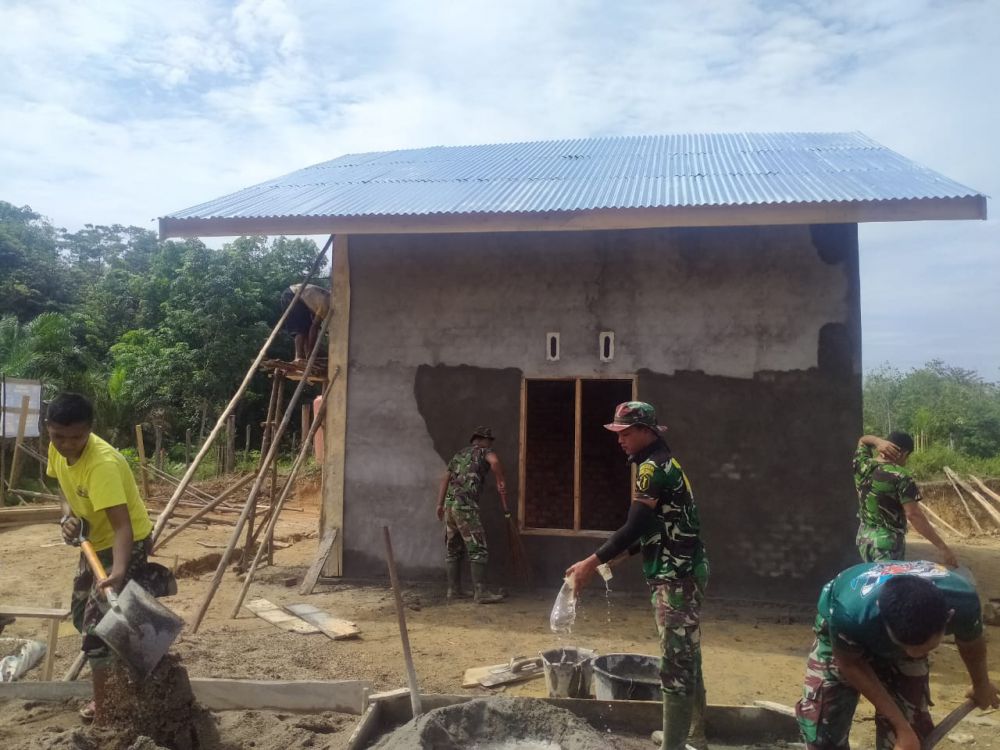 Sertu Sutrisno, anggota satgas TMMD Ke-112 Kodim 0416/Bungo Tebo, mengatakan dirinya bersama dengan warga desa yang juga tukang batu dalam pembangunan rumah terus kebut pengerjaan plester dinding rumah milik Herlina.
