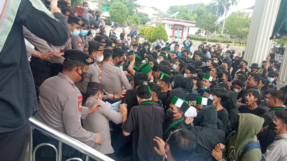 Namun aparat kepolisian yang telah berjaga sedari awal tak membiarkan massa memasuki gedung dewan. Walhasil Polisi dan mahasiswa terlibat aksi fisik dorong-mendorong, bahkan terlihat beberapa orang terlibat perseturuan kecil. Polisi tampak berhasil menguasai situasi dan memukul mundur barisan massa.