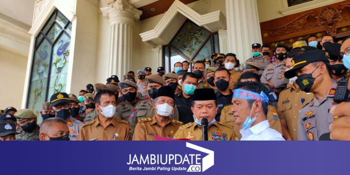 JAMBIUPDATE.CO, JAMBI - Gubernur Jambi Al Haris menunjukkan jiwa kepemimpinannya didepan para pengunjuk rasa pekerja pertanian dan perkebunan pada (6/12) dikantor gubernur Jambi.