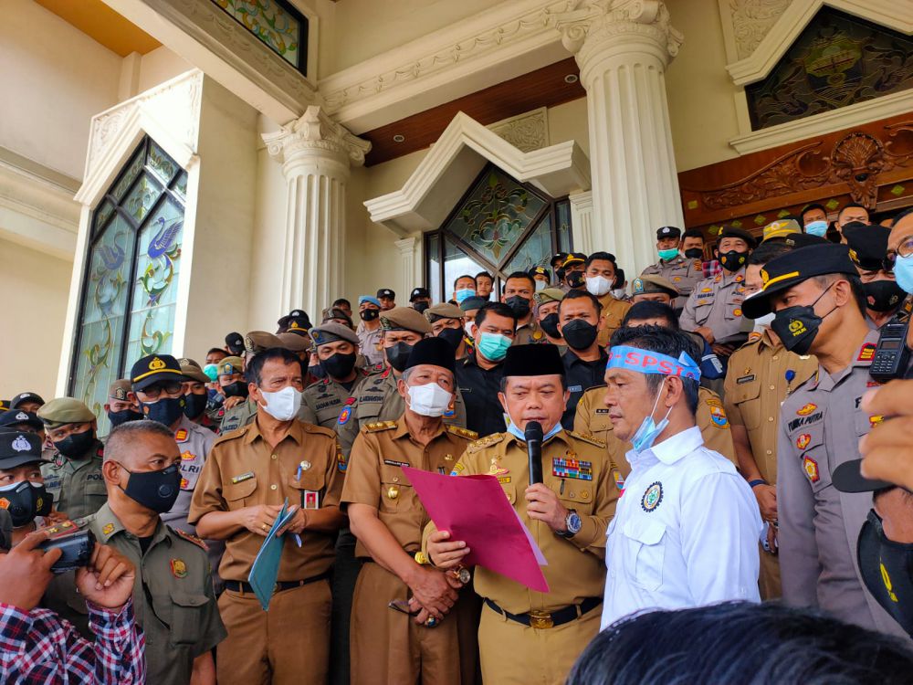 Didepan ratusan massa yang menuntut kenaikan Upah Minimum Provinsi (UMP) sebesar 10 persen, Gubernur menerangkan panjang lebar dia telah berusaha untuk menaikkan upah pekerja.