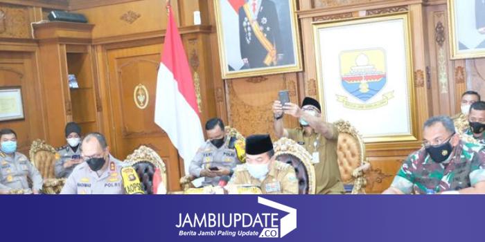 Zoom meeting tersebut di laksanakan di Ruang Rapat Kantor Gubernur Provinsi Jambi pukul 13.30 wib. Tampak dalam layar, Presiden RI di dampingi oleh Mendagri RI, Kemenkes RI, Panglima TNI dan Kapolri.