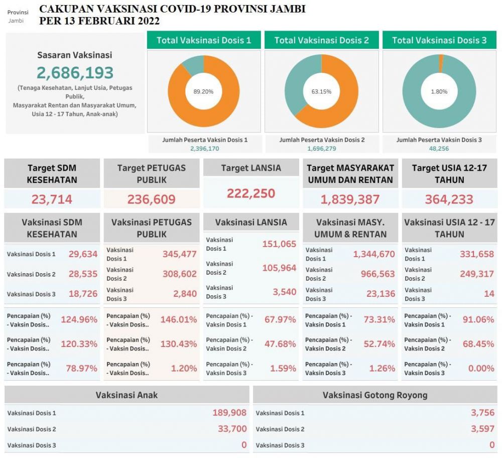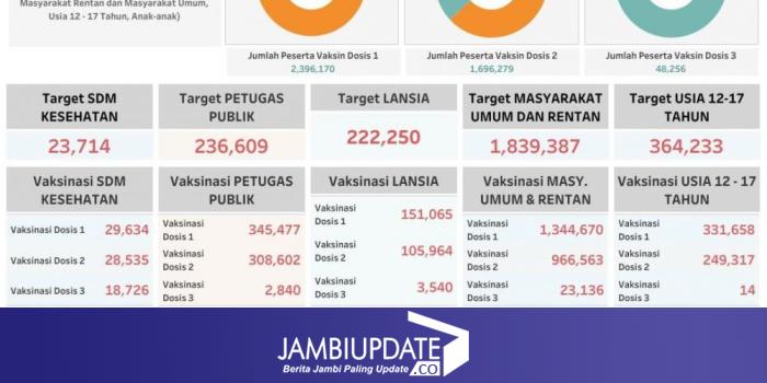 Sementara, untuk tingkat vaksinasi di Jambi sudah tinggi. Untuk vaksinasi dosis pertama tercatat sebanyak 89,20 persen. "Lalu dosis 2 pada angka 63,15. Serta dosis 3 baru mencapai 1,80 persen," paparnya.
