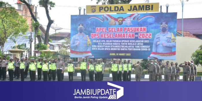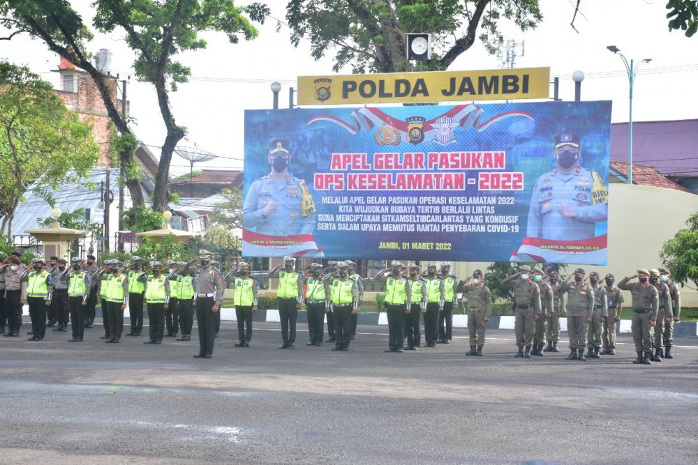 JAMBIUPDATE.CO, JAMBI- Polda Jambi menggelar apel pasukan Operasi Mandiri Keselamatan tahun 2022 di lapangan hitam Mapolda Jambi. Selasa (1/3).