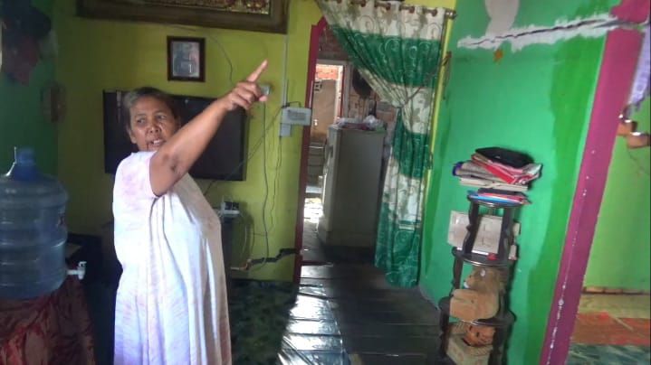 Terlihat bagian dalam rumah yang rusak seperti dinding retak serta plafon rumah rusak. Konstruksi bangunan rumah juga terlihat miring dan dikhawatirkan ambruk.