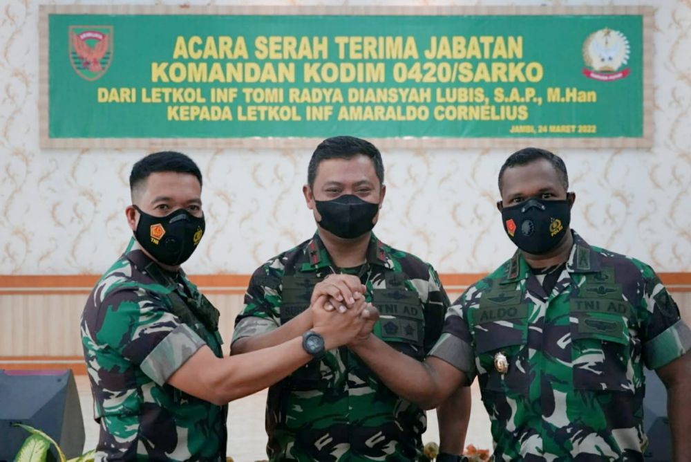 Selanjutnya, Danrem juga mengucapkan selamat kepada Letkol Inf Amaraldo Cornelius beserta isteri, atas kehormatan dan kepercayaan yang diberikan oleh pimpinan untuk menempati jabatan yang baru, sebagai Dandim 0420/Sarko, Korem 042/Gapu. Saya harap dengan berbekal wawasan, pengalaman dan kemampuan sebelumnya dapat mengemban tugas sebagai Dandim 0420/Sarko dengan baik.