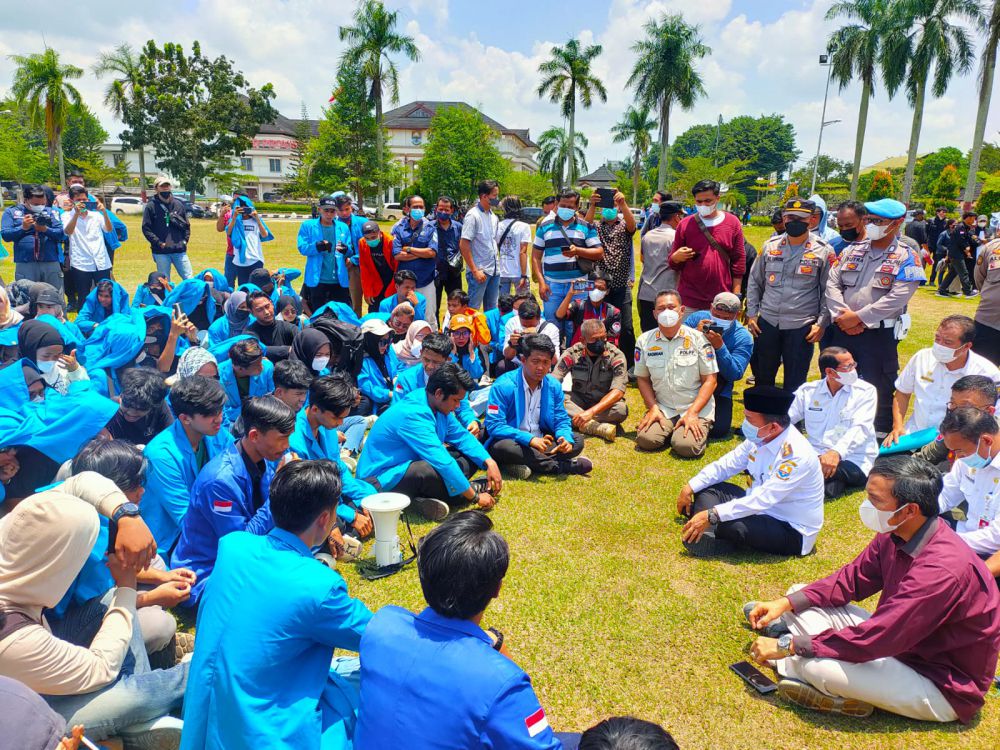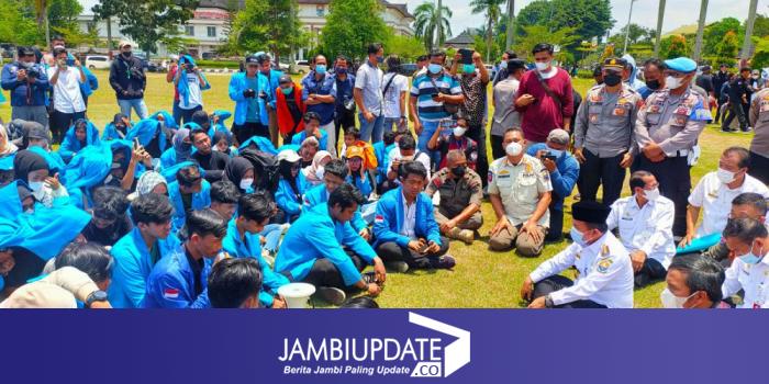 Gubernur Jambi Al Haris dan Ketua DPRD Provinsi Jambi Edi Purwanto diajak mahasiswa berjemur di tengah lapangan kantor Gubernur Jambi.