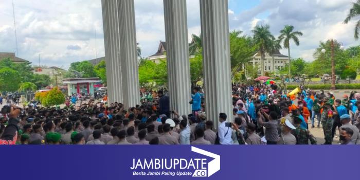 JAMBIUPDATE.CO, JAMBI - Ratusan mahasiswa gabungan beralmamater Universitas Jambi, UIN STS Jambi dan lainnya menyesaki gedung DPRD Provinsi Jambi Senin (11/4) siang.