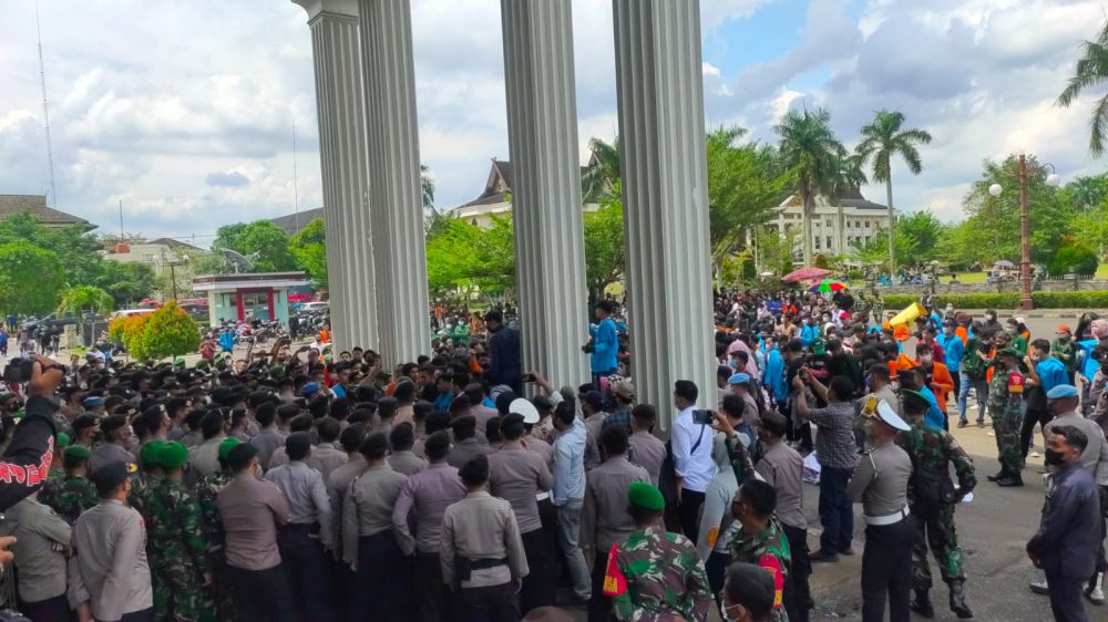 Mahasiswa tumpah di depan pintu masuk kantor DPRD. Massa meminta bertemu Gubernur Jambi, Kapolda Jambi, Ketua Fraksi DPRD.
