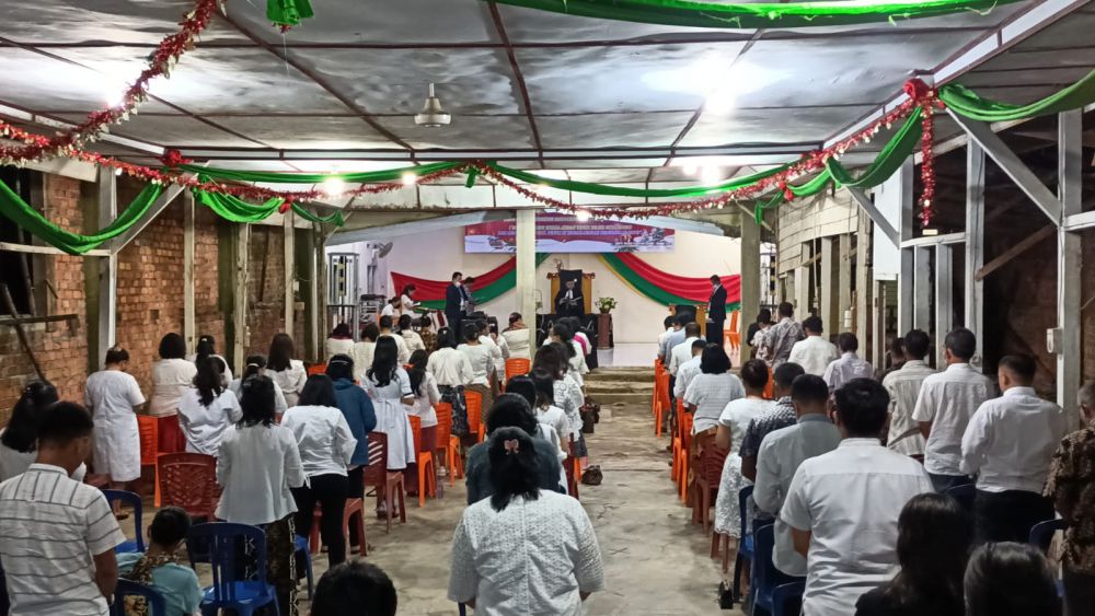 Di sela gedung geraja yang belum rampung pada tahap pembangunan, seluruh jemaat yang berseragam serba putih tampak khidmat dan larut sejak awal ibadah dimulai, yang malam ini dibawa oleh Pendeta Rudiat Saragih.
