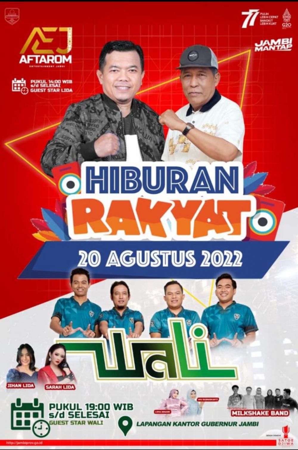 Hiburan rakyat itu dilaksanakan di lapangan Kantor Gubernur Jambi malam nanti, Sabtu 20 Agustus 2022 mulai pukul 19.00 WIB.