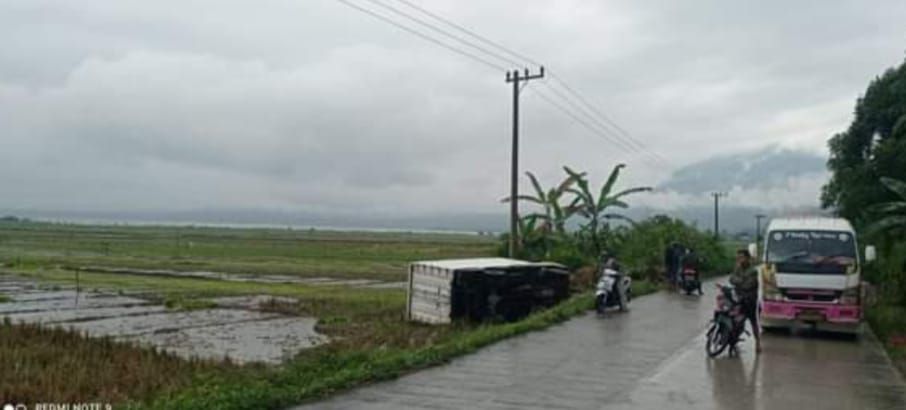 Mobil kemudian oleng dan menabrak tiang listrik. Setelah itu, mobil terguling masuk sawah.
