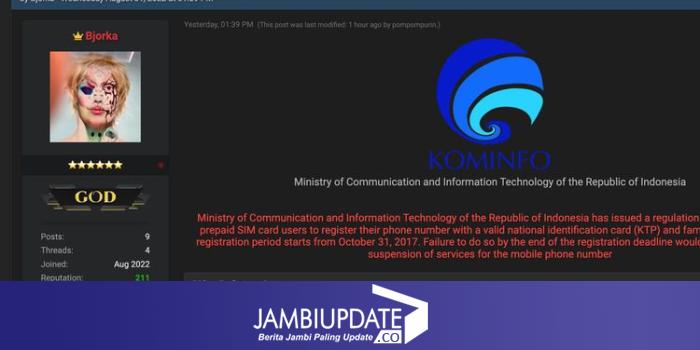 JAMBIUPDATE.CO, JAKARTA - Bjorka anggota forum Breached pada 31 Agustus 2022 memiliki data 1,3 miliar nomor telepon seluler di Indonesia.