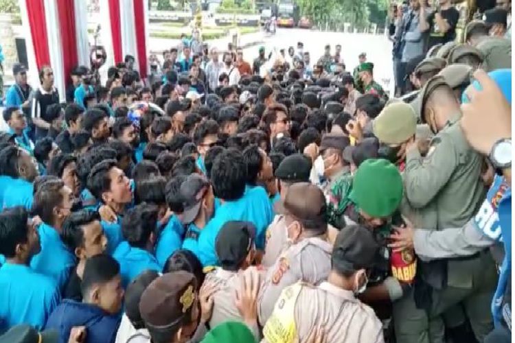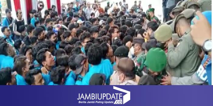 Massa yang memaksa ingin masuk ke Kantor DPRD Jambi sempat terlibat aksi saling dorong dengan pihak kepolisian.