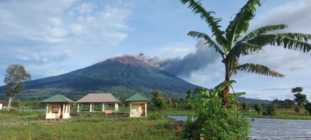 JAMBIUPDATE.CO, KERINCI - Hingga hari ke 10, sejak 18 Oktober sampai Kamis 27 Oktober 2022 Gunung Kerinci masih erupsi. Asap tebal warna kehitaman atau abu vulkanik terus menyembur dari kawah gunung api tertinggi di Sumatera itu.