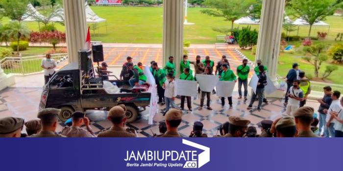 JAMBIUPDATE.CO, JAMBI - Sejumlah massa yang tergabung dalam Gabungan Aksi Roda Dua (GARDA) dan pengemudi Ojek Online (OJOL) melakukan aksi di depan kantor gubernur Jambi, Senin (31/10).