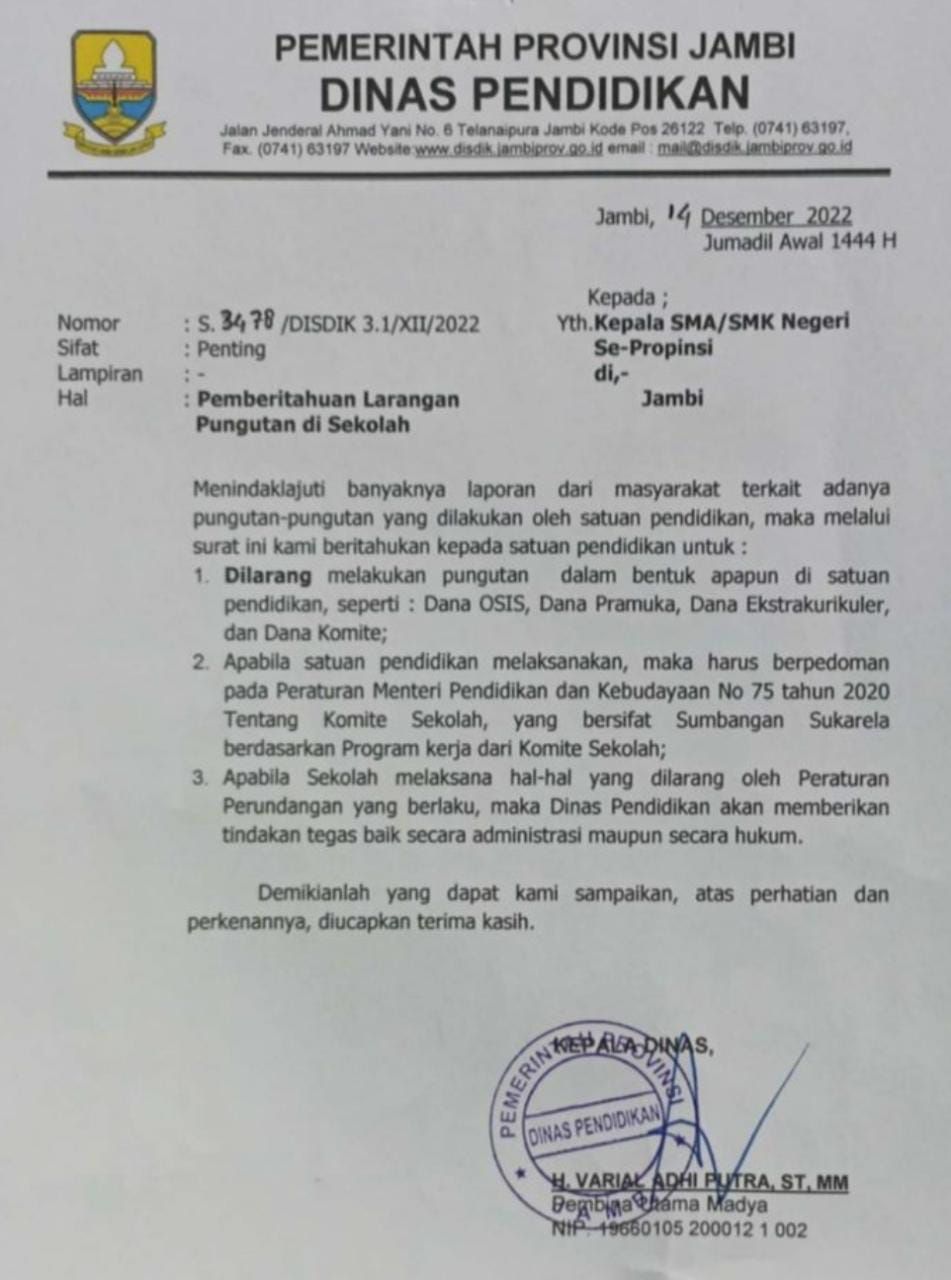 Surat dengan nomor S.3478/DISDIK3.1/XII2022 tertanggal 14 Desember ini ditandatangani langsung oleh Kepala Dinas Pendidikan Provinsi Jambi, Varial Adhi Putra, serta ditujukan kepada seluruh Kepala Sekolah SMA dan SMK Negeri di Provinsi Jambi.