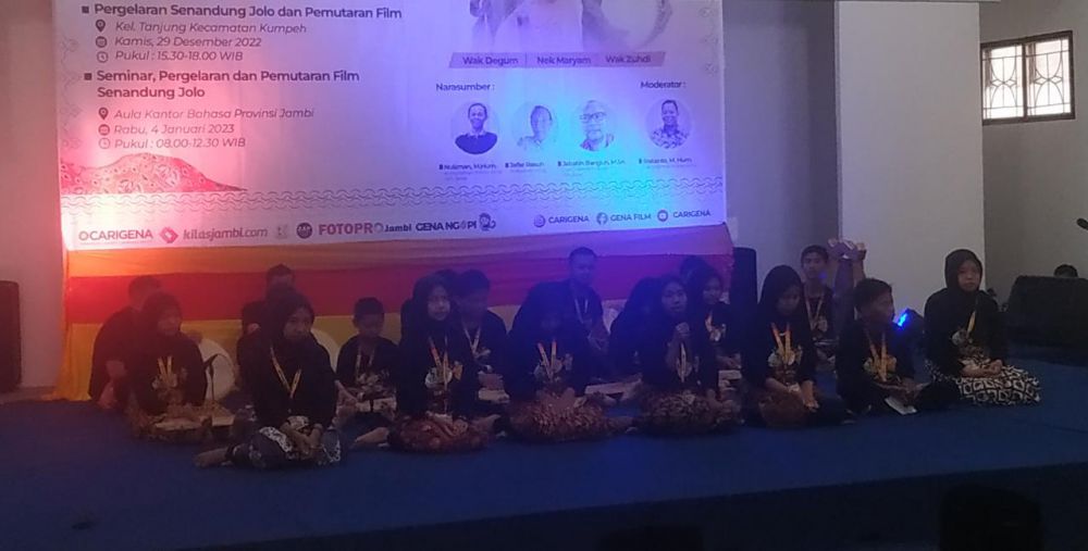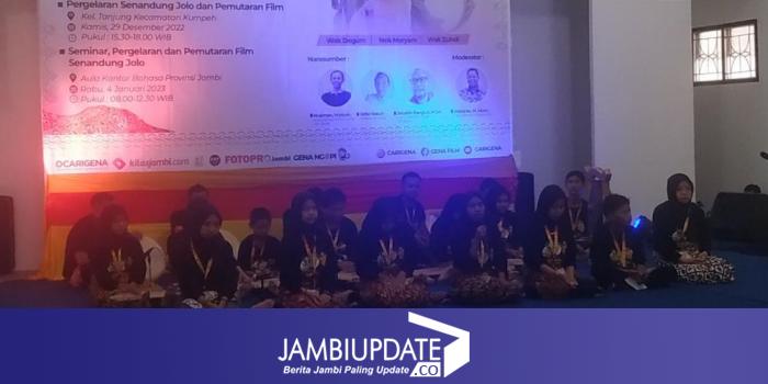 JAMBIUPDATE.CO, JAMBI- Sebanyak 20 penutur muda melakukan pementasan Senandung Jolo di kantor Bahasa Provinsi Jambi, Rabu (5/1/2023). Mereka tampil sekaligus mengisi acara seminar, pergelaran dan pemutaran film Senandung Jolo yang dihadiri Wakil Gubernur Jambi, Abdullah Sani.