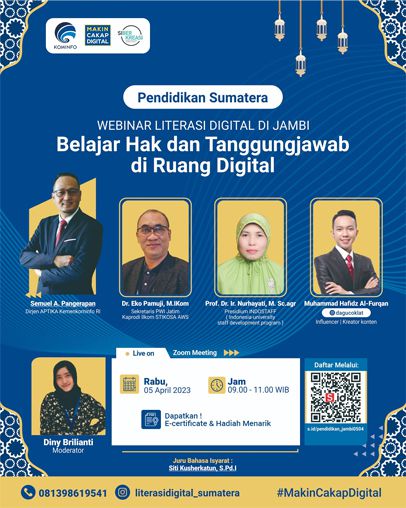 JAMBIUPDATE.CO,- Rangkaianwebinar literasi digital di Kabupaten Muaro Jambi, Provinsi Jambiakankembalibergulir. Pada Rabu (5/4)pukul09.00-11.00 WIB, akandilangsungkanwebinarbertajuktema “Belajar Hak dan Tanggungjawab di Ruang Digital”. Kegiataninimerupakankerjasama Kementerian Komunikasi dan InformatikaRepublik Indonesiadengan SMPN 8 Muaro Jambi dan SMPN 4 Muaro Jambidenganmelibatkan para siswasebagaiaudiensnya.
