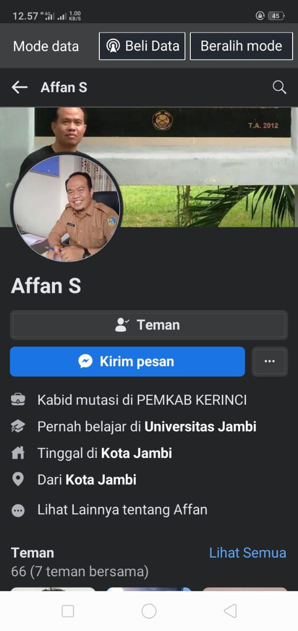 JAMBIUPDATE.CO, KERINCI- Beredar di sosial media akun palsu mengatasnamakan Affan selalu Kabid Pengadaan, Kepangkatan, Mutasi dan Pensiun (PKMP) pada BKPSDM Kerinci. Akun palsu tersebut ada di Facebook dan WhatApp dengan menggunakan foto dan nama Kabid PKMP.
