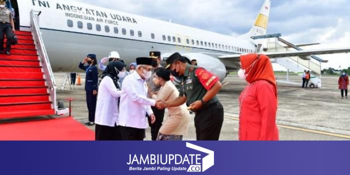 Tampak hadir menyambut di Bandara Sultan Thaha, Gubernur Jambi Al Haris, Kapolda Jambi Irjen Pol Rusdi Hartono, Danrem 042/Garuda Putih Brigjen TNI Supriono, serta Danlanal Palembang Kolonel Laut (P) Widyo Sasongko. Selain itu, tarian Selamat Datang dan pengalungan syal turut mengiringi kedatangan Wapres di kota berjuluk Bumi Melayu ini.