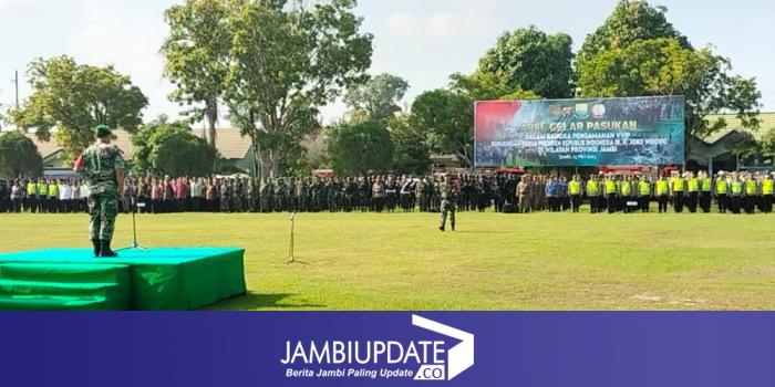 JAMBIUPDATE.CO, JAMBI - Apel gelar pasukan dalam rangka pengamanan kunjungan kerja (kunker) Presiden Republik Indonesia, Joko Widodo, dilaksanakan pada Senin (15/5) pagi, di Markas Batalyon Infanteri 142/KJ.