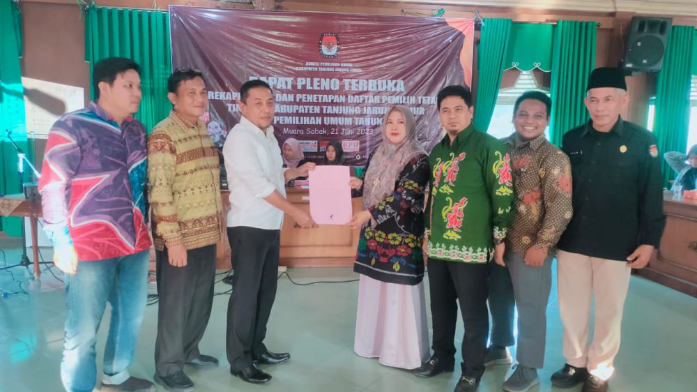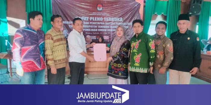 JAMBIUPDATE.CO, MUARASABAK - KPU Kabupaten Tanjabtim menggelar Rapat Pleno Terbuka rekapitulasi dan penetapan Daftar Pemilih Tetap (DPT) tingkat kabupaten untuk Pemilu tahun 2024, Rabu (21/6) sore.