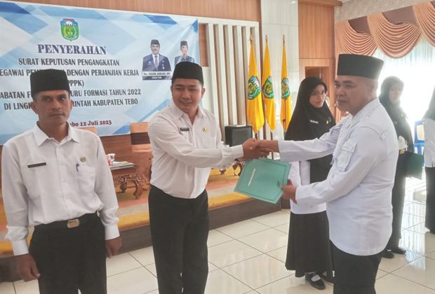 JAMBIUPDATE.CO, MUARATEBO- Sebanyak 271 orang tanaga honorer Guru di Kabupaten Tebo telah menerima Surat Keputusan (SK) pengangkatan sebagai Pegawai Pemerintah dengan Perjanjian Kerja (PPPK), yang diserahkan secara simbolis di aula Rumah Dinas Bupati Rabu (12/7) kemarin.