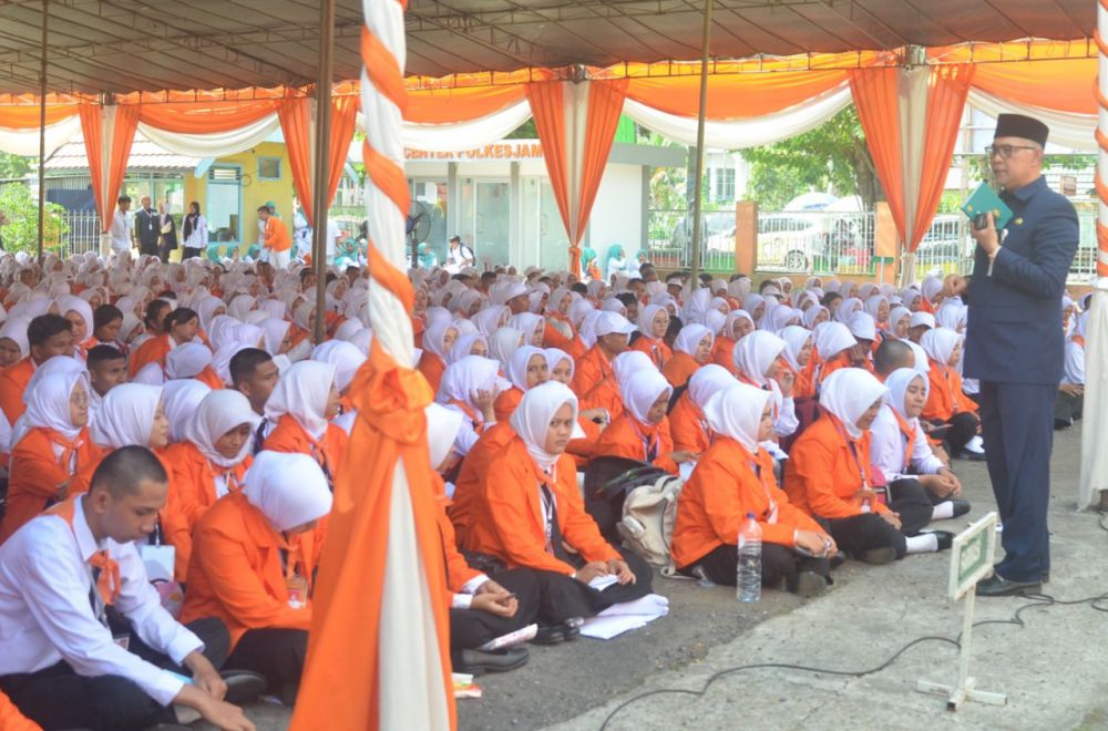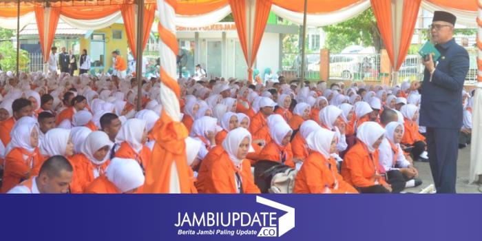 JAMBIUPDATE.CO, JAMBI- Wali Kota Jambi Syarif Fasha berikan pembekalan kepada ribuan mahasiswa Politeknik Kesehatan Kementerian Kesehatan Jambi, bertempat di pelataran Gedung Kampus Politeknik Kemenkes Jambi, Senin (31/7/2023). Acara tersebut merupakan rangkaian kegiatan Pengenalan Kehidupan Kampus Bagi Mahasiswa dan Mahasiswi Baru (PKKMB) Politeknik Kesehatan Kemenkes Jambi Tahun Akademik 2023/2024.