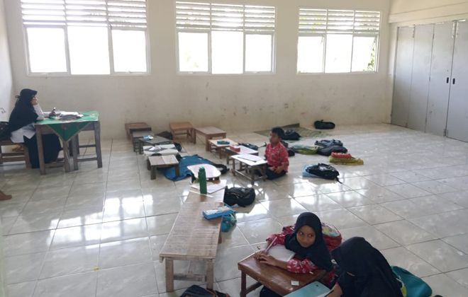 "Kondisi mau tidak mau harus kami lakukan, karena memang fasilitas meja dan kursi kami tidak mencukupi dengan jumlah siswa yang ada," katanya.