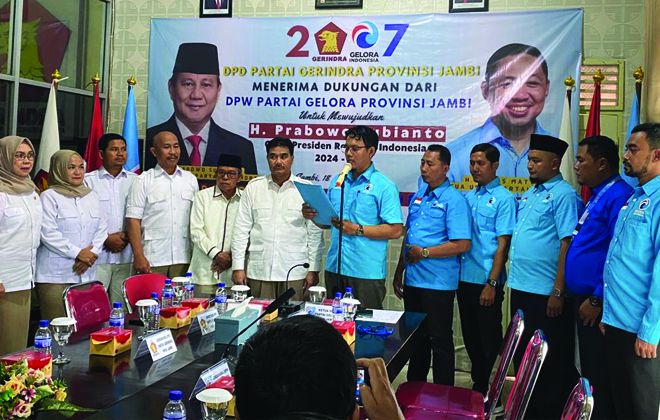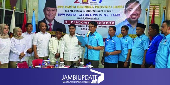 JAMBIUPDATE.CO, JAMBI- Ketua DPW Partai Gelora Provinsi Jambi Mahyudi dan Ketua DPD Partai Gerindra Provinsi Jambi Dr. Ir. H. A.R. Sutan Adil Hendra, MM membacakan pernyataan dukungan dan siap memenangkan Prabowo Subianto pada Pilpres 2024.