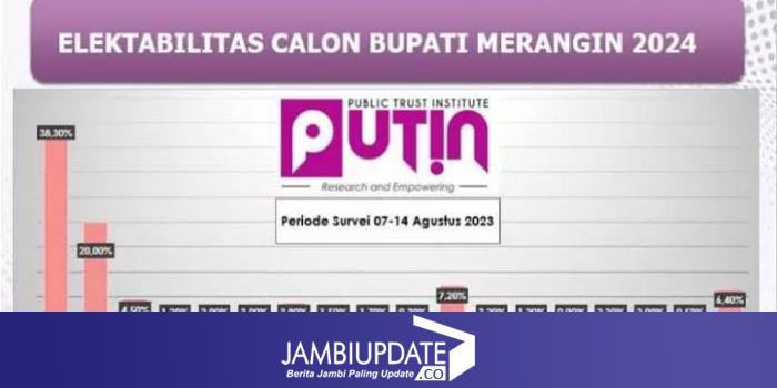 JAMBIUPDAT.CO, JAMBI- Lembaga Riset Sosial Politik Public Trust Institute (PUTIN) merilis hasil survei menjelang Pilkada Merangin 2024. Survei ini dilakukan pada tanggal 07-14 Agustus 2023 melalui wawancara tatap muka terhadap 600 responden terpilih di seluruh wilayah Kabupaten Merangin.