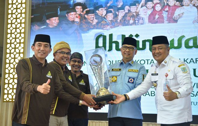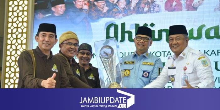JAMBIUPDATE.CO, JAMBI- Kota Jambi sukses mempertahankan supremasi tertinggi sebagai Juara Umum perhelatan Musabaqah Tilawatil Quran (MTQ) ke-52 tahun 2023 tingkat Provinsi Jambi yang telah berlangsung di Kabupaten Sarolangun, pada tanggal 21 hingga 30 Agustus lalu. Prosesi penyerahan trofi Juara MTQ dilakukan dalam rangkaian acara penutupan yang berlangsung pada Selasa malam (29/8/2023). Menerima secara langsung, Wakil Wali Kota Jambi dr. H. Maulana dari Wakil Gubernur Jambi, H. Abdullah Sani.