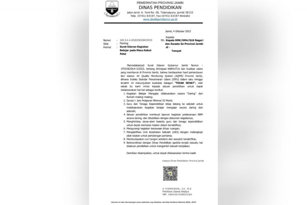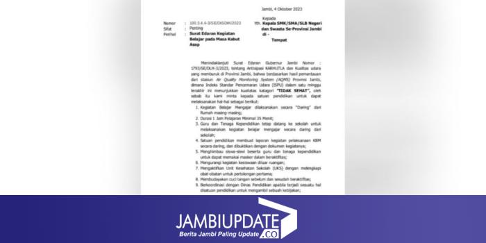 Surat Edaran perpanjangan masa belajar dari rumah ini dikeluarkan Disdik Provinsi Jambi mengingat kualitas udara yang masih tidak sehat.