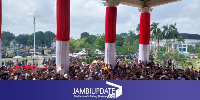 JAMBIUPDATE.CO, JAMBI- Ribuan Sopir angkutan batu bara berunjuk rasa di kantor Gubernur Jambi, Senin (22/1/2024). Mereka menuntut jalan nasional darat kembali dibuka untuk mengangkut tambang batu bara, setelah kebijakan penutupan dan pengalihan ke jalur sungai sejak awal Januari ini.