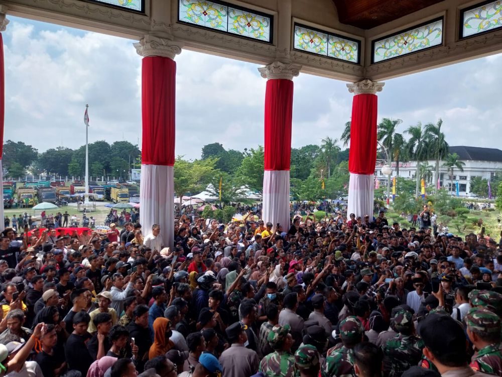 Tampak Ketua KS Bara Tursiman memegang kendali demo. Salah seorang pendemo mempertanyakan kepada Gubernur yang menemui pendemo.