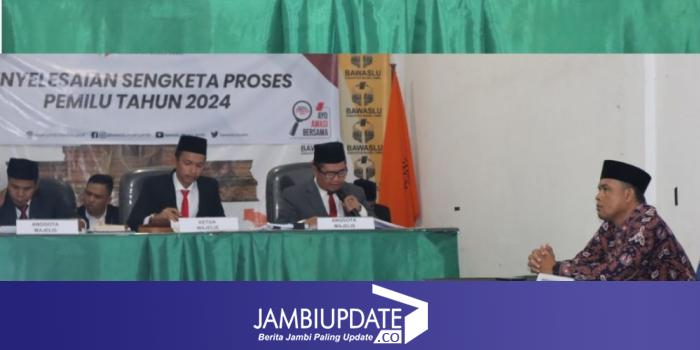 iklan Anggota Bawaslu Muaro Jambi, Dedi Wahyudi (tengah) memimpin sidang peyelesaian sengketa proses Pemilu 2024.