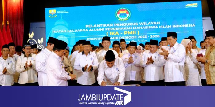 JAMBIUPDATE.CO, JAMBI- Gubernur Jambi Dr. H. Al Haris, S.Sos., MH mengatakan bahwa Pergerakan Mahasiswa Islam Indonesia (PMII) Provinsi Jambi sukses mencetak kader dalam berbagai sektor di Provinsi Jambi. Hal ini disampaikannya pada Pelantikan Pengurus Wilayah Ikatan Keluarga Alumni Pergerakan Mahasiswa Islam Indonesia (PW IKA PMII) Provinsi Jambi, bertempat di Auditorium Rumah Dinas Gubernur Jambi, Sabtu (27/01/2024).