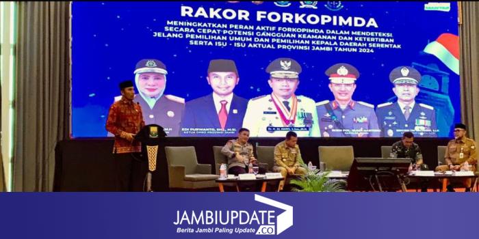 JAMBIUPDATE.CO,- Ketua DPRD Provinsi Jambi, Edi Purwanto menjadi pembicara di rapat koordinasi forkompimda untuk meningkatkan peran aktif forkompimda dalam mendeteksi secara cepat potensi gangguan keamanan dan ketertiban jelang pemilihan umum dan pemilihan kepala daerah serentak serta isu-isu aktual provinsi jambi tahun 2024, Senin (12/2) di Swisbell Hotel.