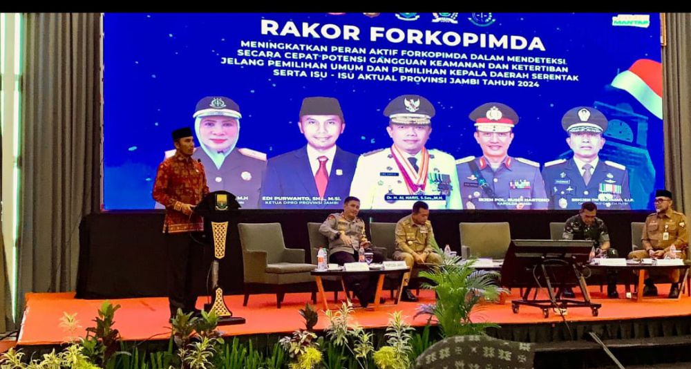Ketua DPRD Provinsi Jambi, Edi Purwanto menjadi pembicara di rapat koordinasi forkompimda untuk meningkatkan peran aktif forkompimda dalam mendeteksi secara cepat potensi gangguan keamanan dan ketertiban jelang pemilihan umum dan pemilihan kepala daerah serentak serta isu-isu aktual provinsi jambi tahun 2024, Senin (12/2) di Swisbell Hotel.