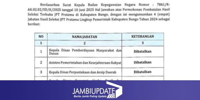 JAMBIUPDATE.CO, MUARA BUNGO - Pemerintah Kabupaten Bungo mengumumkan pembatalan hasil akhir seleksi terbuka Jabatan Pimpinan Tinggi (JPT) Pratama yang dilaksanakan pada masa Bupati Mashuri.