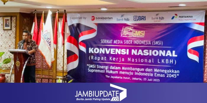 JAMBIUPDATE.CO, JAKARTA - Serikat Media Siber Indonesia (SMSI) Pusat menggelar konvensi nasional dengan mengusung tema SMSI sinergi dalam membangun dan menegakkan supremasi hukum menuju Indonesia Emas 2045, bertempat di The Jayakarta, Jum’at (25/7/2025).