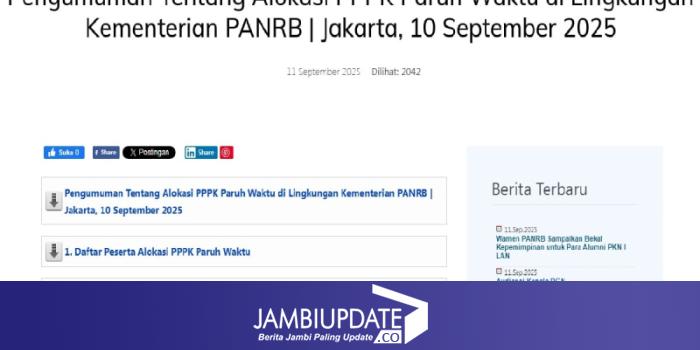 Dalam pengumuman yang dirilis, Kamis, 11 September 2025, di laman Kementerian PANRB menyatakan bahwa daftar peserta yang lolos alokasi PPPK Paruh Waktu bisa dilihat melalui tautan ini.