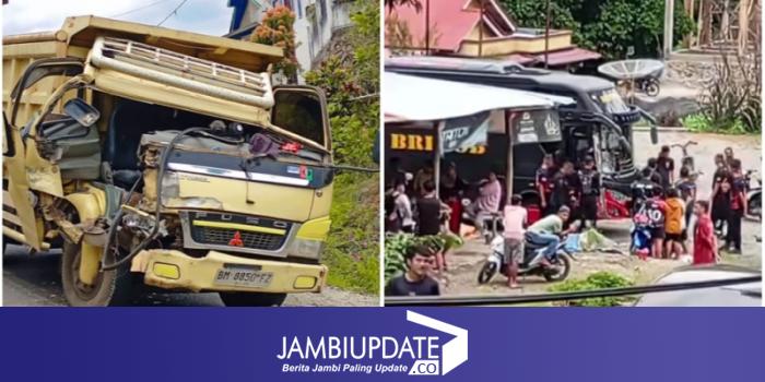 JAMBIUPDATE.CO, KERINCI - Kecelakaan lalu lintas terjadi di Desa Baru Pulau Sangkar, Kecamatan Batang Merangin, Kabupaten Kerinci, pada Jumat siang (12/9/2025). Sebuah mobil dum truck bertabrakan dengan minibus milik Brimob di tikungan jalan menuju desa tersebut.